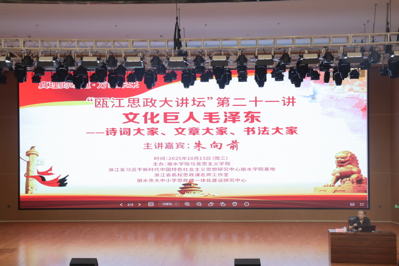10月15日晚上,“瓯江思政大讲坛”第二十一讲于学术交流中心报告厅举办。本场讲坛特邀解放军艺术学院原副院长、国务院特殊津贴获得者朱向前教授作题为《文化巨人毛泽东——诗词大家、文章大家、书法大家》专题讲座。马克思主义学院负责人主持讲座。