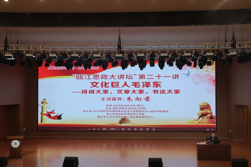 为深化青年学子对思想政治文化的理解和对毛泽东的了解,厚植爱党爱国情怀,10月15日晚,马克思主义学院在丽水学院学术交流中心报告厅主办“瓯江思政大讲坛”第二十一讲。讲座由马克思主义学院院长龚志伟主持,特邀解放军艺术学院教授,中国毛泽东诗词研究会副会长朱向前担任主讲人,全校师生400余人参加讲座。
