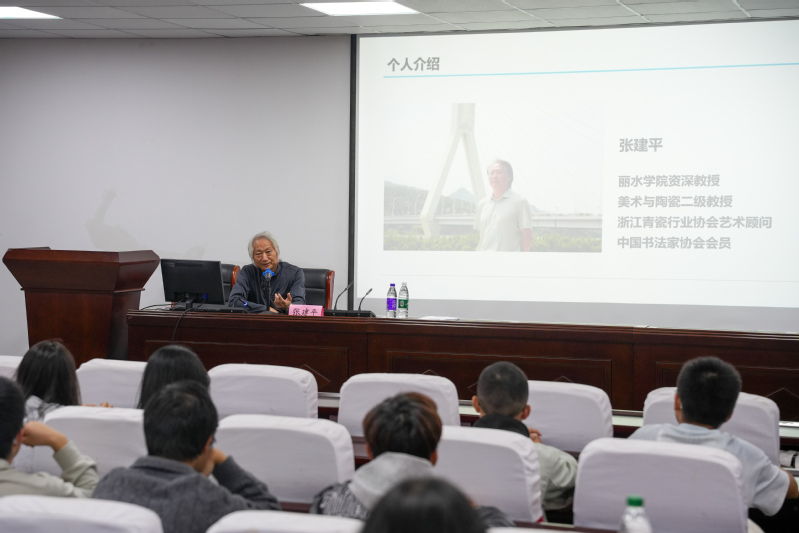讲座尾声,张建平教授以“人生感悟”作结。他从童年瓯江畔摸鱼跳水的野趣、少年露天球场捡球模仿的逐梦,谈到青年受家训“坦坦荡荡做人,踏踏实实做事”的浸润,直言“自然与家风是人格的初始底色”。他更以“书韵青瓷”创作寄语学子:“文化传承需以自身被塑造的生命,传递文化的力量。”