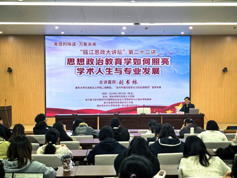 11月14日晚,“瓯江思政大讲坛”第二十二讲在丽水学院学前教育师范中心报告厅顺利开讲。本次讲座特邀清华大学马克思主义学院二级教授、“当代中国马克思主义历史研究”首席专家刘书林教授,作题为《思想政治教育学如何照亮学术人生与专业发展》的专题报告。马克思主义党总支副书记李鹏主持讲座,思政专业2023级、2024级、2025级全体学生到场聆听。