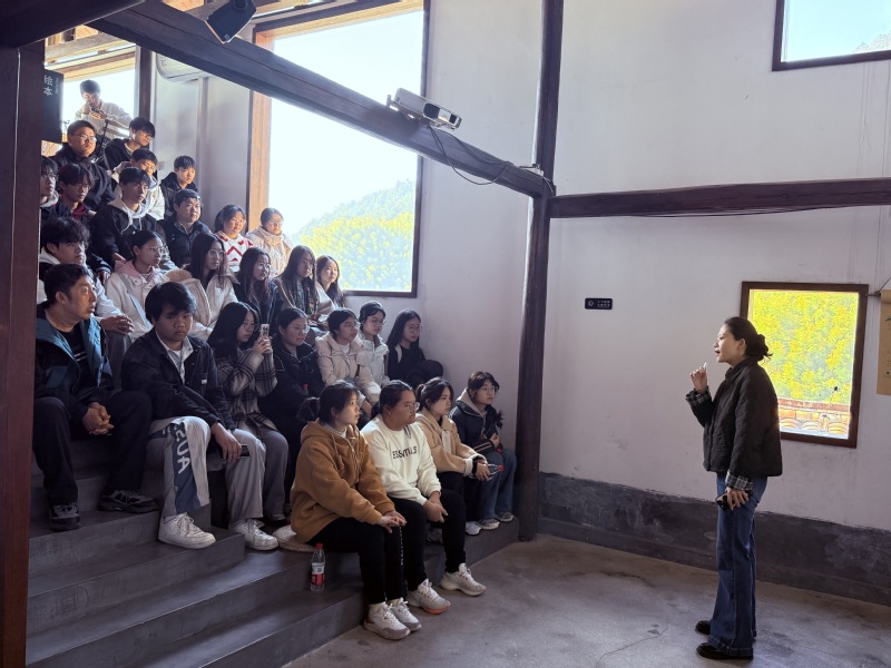 上午,师生团队前往陈家铺村,探访诗意民宿集群。曾经闲置的老屋,在“文化赋能” 理念指引罡,变身兼具乡土韵味与现代美学的民宿,保留了古村肌理,又注入了新的生命力。在 “飞蔦集”“先锋书局” 等特色民居,师生们深入了解 “古村活化” 的创新路径。马克思主义学院教师蓝翊嘉结合陈家铺创造性转换和创新性发展案例,开展现场教学,引导学生思考 “绿水青山” 与 “金山银山” 的转化逻辑,感悟新时代绿色发展之美。