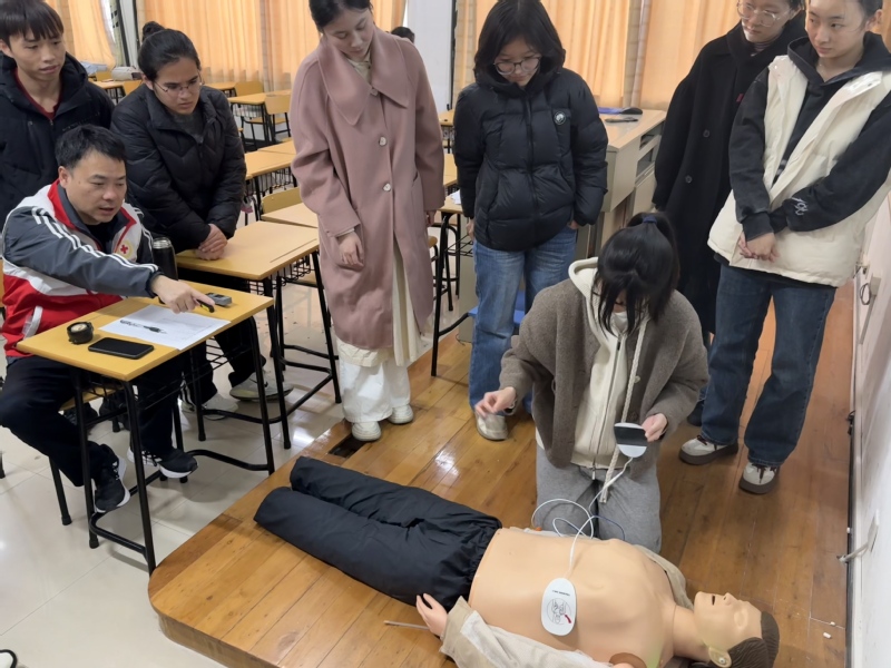 培训伊始,红十字会专业讲师系统讲解了心脏骤停的识别、现场评估、呼救求助的要点,并重点演示了心肺复苏(CPR)的操作流程及自动体外除颤器(AED)的使用方法。讲师强调,心脏骤停发生后的“黄金四分钟”是挽救生命的关键窗口,规范、及时的现场急救至关重要。讲解深入浅出,结合真实案例,使在场师生深刻认识到掌握急救技能的必要性。