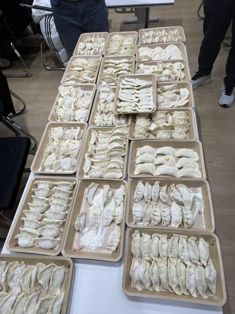 活动现场,同学们分组协作,氛围温馨融洽。学院精心准备了五种丰富的馅料与现成的饺子皮。手法熟练的同学主动示范,耐心指导;初次尝试的伙伴则认真观摩,积极提问。在互帮互学、笑语不断的互动中,一个个饱满精巧的饺子逐渐摆满餐盘。大家边包边聊,交流着家乡不同的饺子的形状与习俗,在动手实践中深化了对传统饮食文化的理解,更在紧密配合中增强了团队的凝聚力。